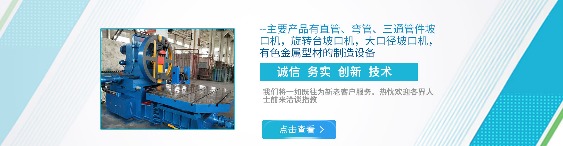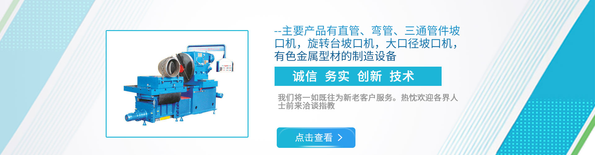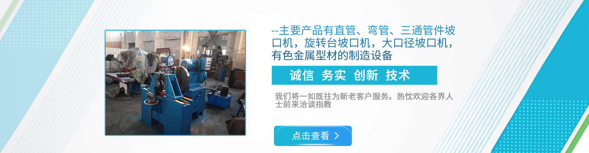 公司現(xiàn)下轄兩個(gè)分廠,一分廠主營電動管道坡口機(jī)和焊接設(shè)備,適用于造船、電力工程安裝、石油、化工、鍋爐廠、冶金以及鋼鐵行業(yè); 二分廠主營雙頭坡口機(jī),600mm直管坡口機(jī)和金屬型材擠壓生產(chǎn)線,適用于銅、鋁、鎂、鉛、鋅等有色金屬及其合金的加工。